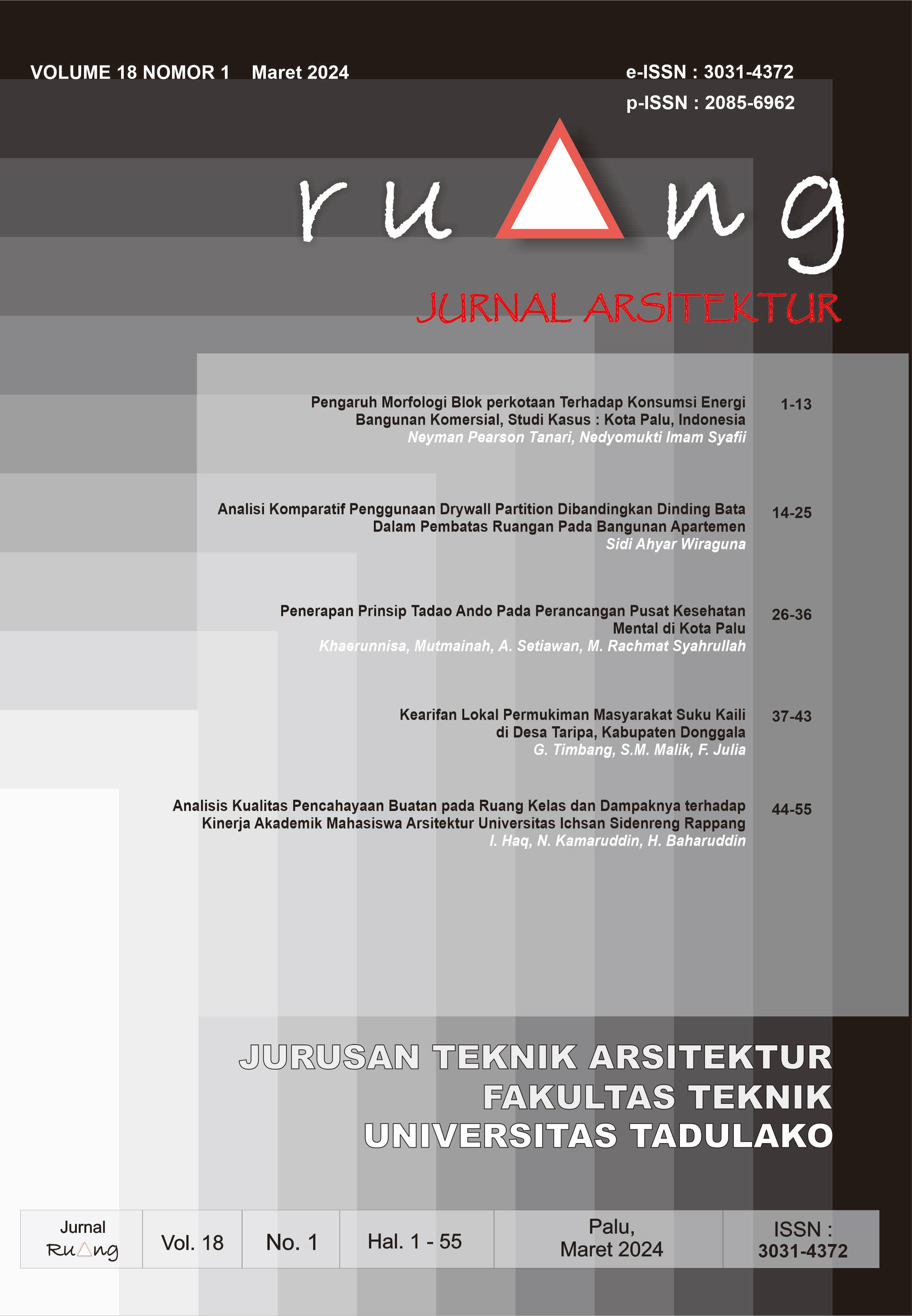 Ruang: Jurnal Arsitektur draws on contributions from academics and practitioner-researchers in the field of Architecture. The journal acts as a forum for critical studies, innovative architectural practices in the latest technological developments, and creative architectural designs, which address themes that may be specific in nature (e.g., architectural design, architectural theory and history, architectural science and technology, settlement and urban design) or at the convergence of two or more disciplines.